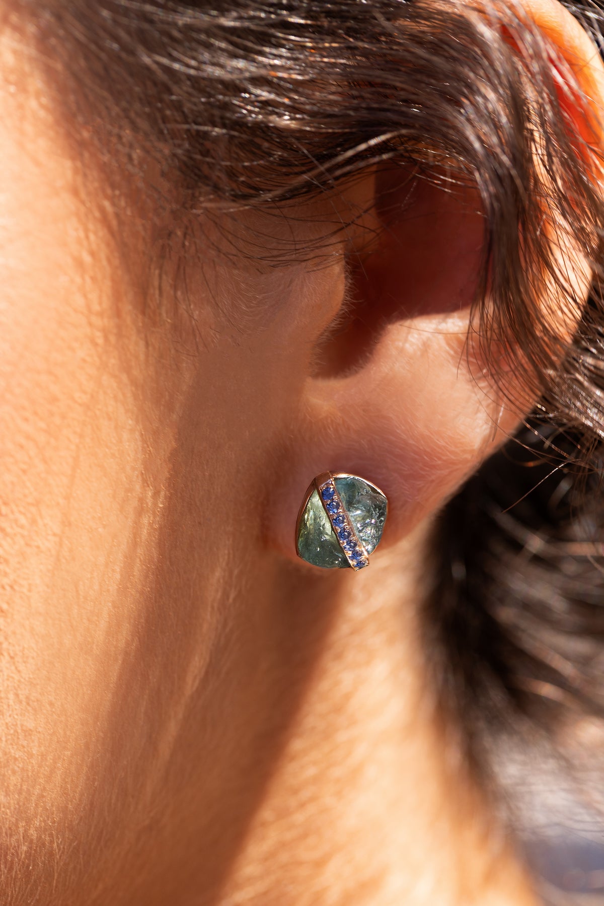 This stylish Elemental Stud Blue on Blue is set in 18-karat pink gold with rough aquamarine and blue sapphire.
