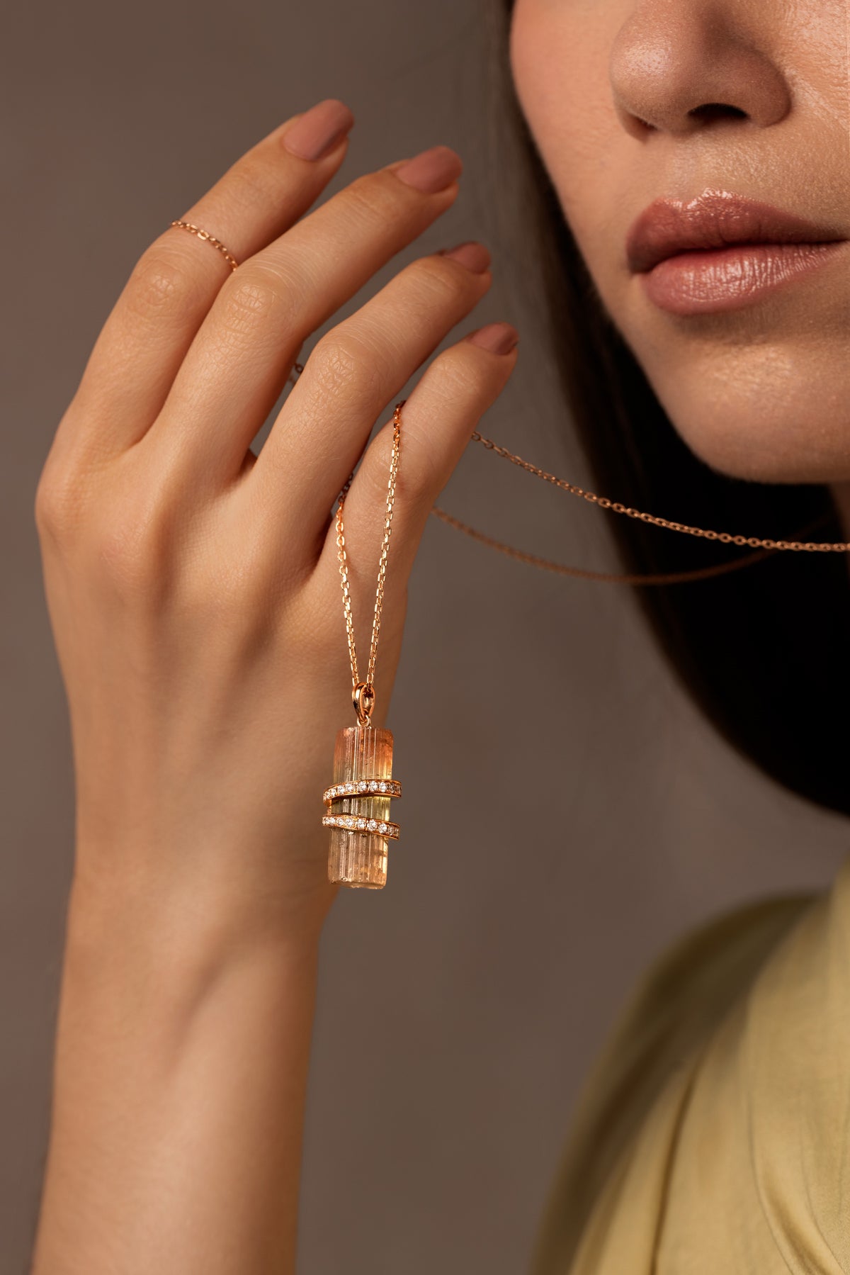 18K pink gold, rough watermelon tourmaline, white diamonds