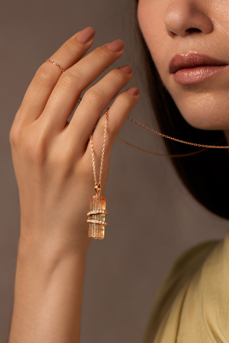 This beautiful Elemental Large Pendant Watermelon is set in 18-karat pink gold with rough watermelon tourmaline and white diamonds.