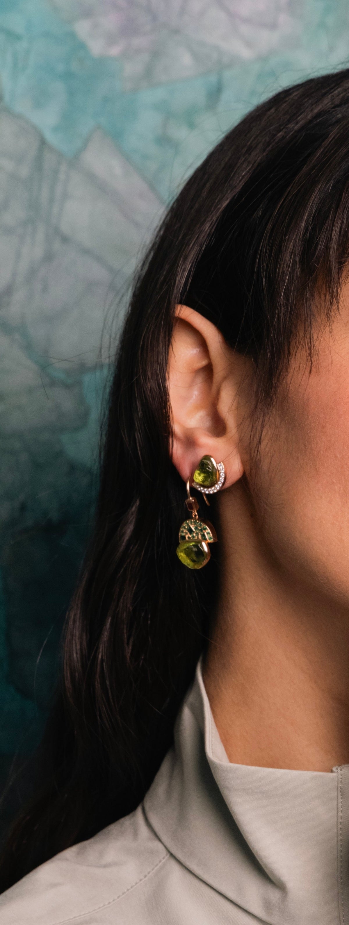 These Half Moon Drop Earrings Green & Red are set in 18-karat pink gold with rough peridot, ruby and green sapphire.