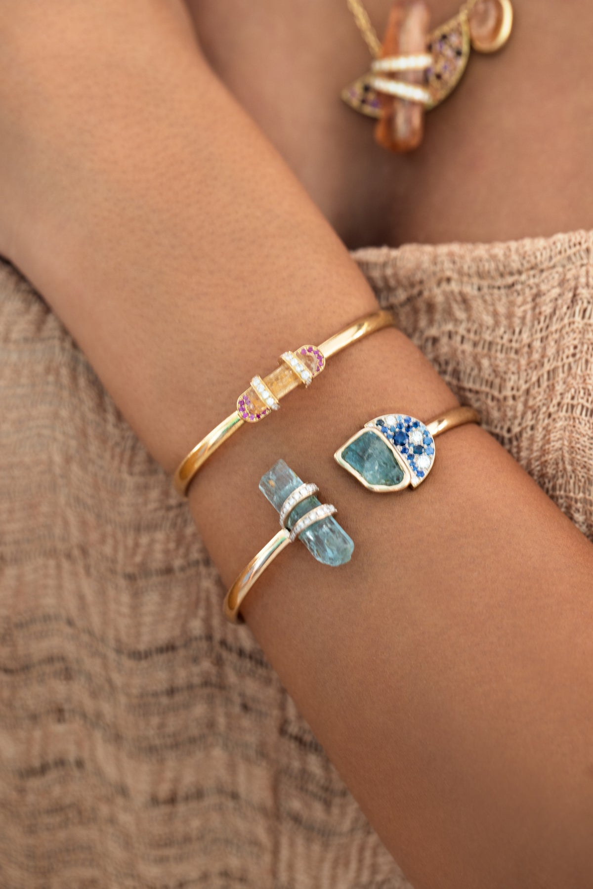 This Elemental Cuff Yellow & Pink is set in 18-karat yellow gold with rough imperial topaz, pink sapphire and white diamonds.