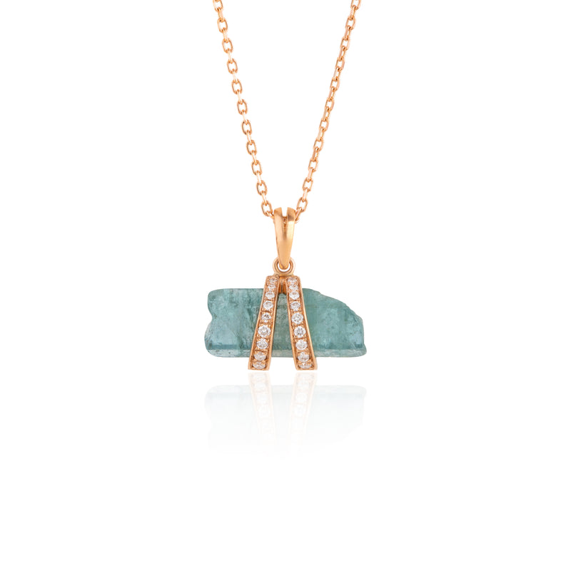 This gorgeous Elemental Medium Pendant Blue is set in 18-karat pink gold with rough aquamarine and white diamonds.