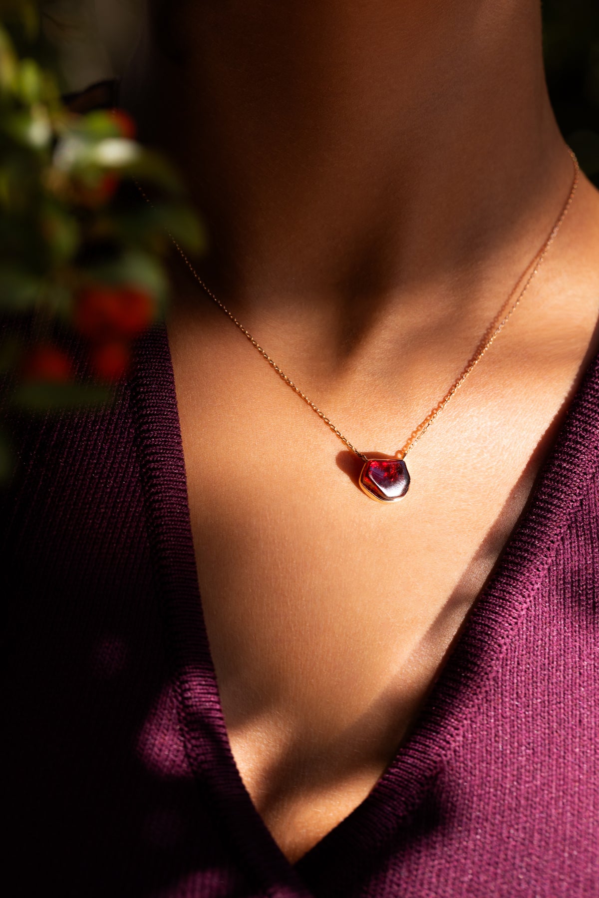 This beautiful Elemental Medium Necklace Red is set in 18-karat pink gold with rough garnet.