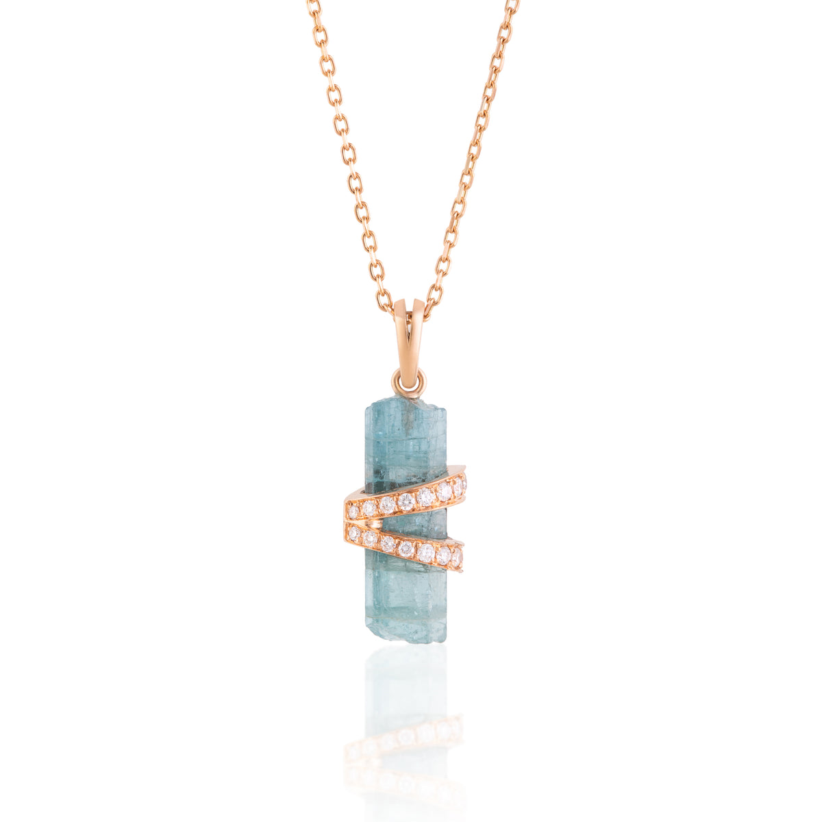 This gorgeous Elemental Medium Pendant Blue is set in 18-karat pink gold with rough aquamarine and white diamonds.