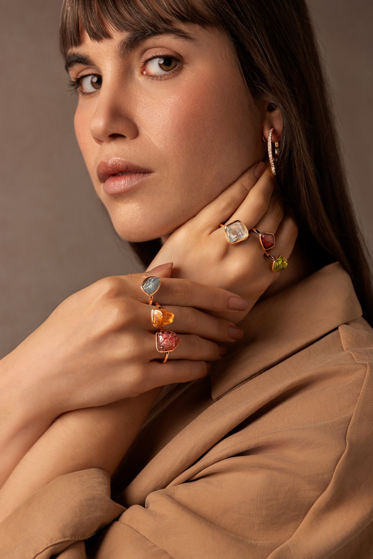 Sienna, Clara Chehab’s second collection, is inspired by the birth of her baby girl. Continuing the high level of intricate craftsmanship and Clara’s love of gems in natural forms, Sienna focuses on candy-esque tumbled stones mixed with faceted gems and diamonds.