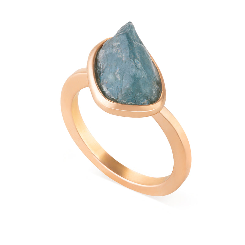 This charming Elemental Small Ring Blue is set in 18-karat pink gold with rough aquamarine.