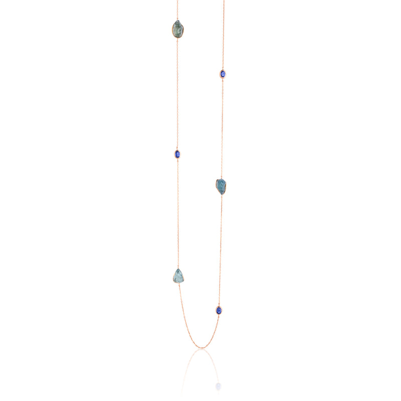 This glamorous Sautoir Blue On Blue is set in 18-karat pink gold with rough aquamarine and blue sapphire.