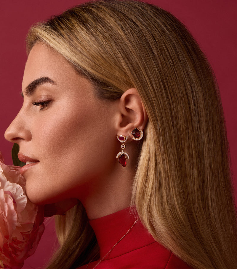 The dazzling Medium Sequence Earrings Red are set in 18-karat pink gold with rough garnet, ruby and white diamonds.